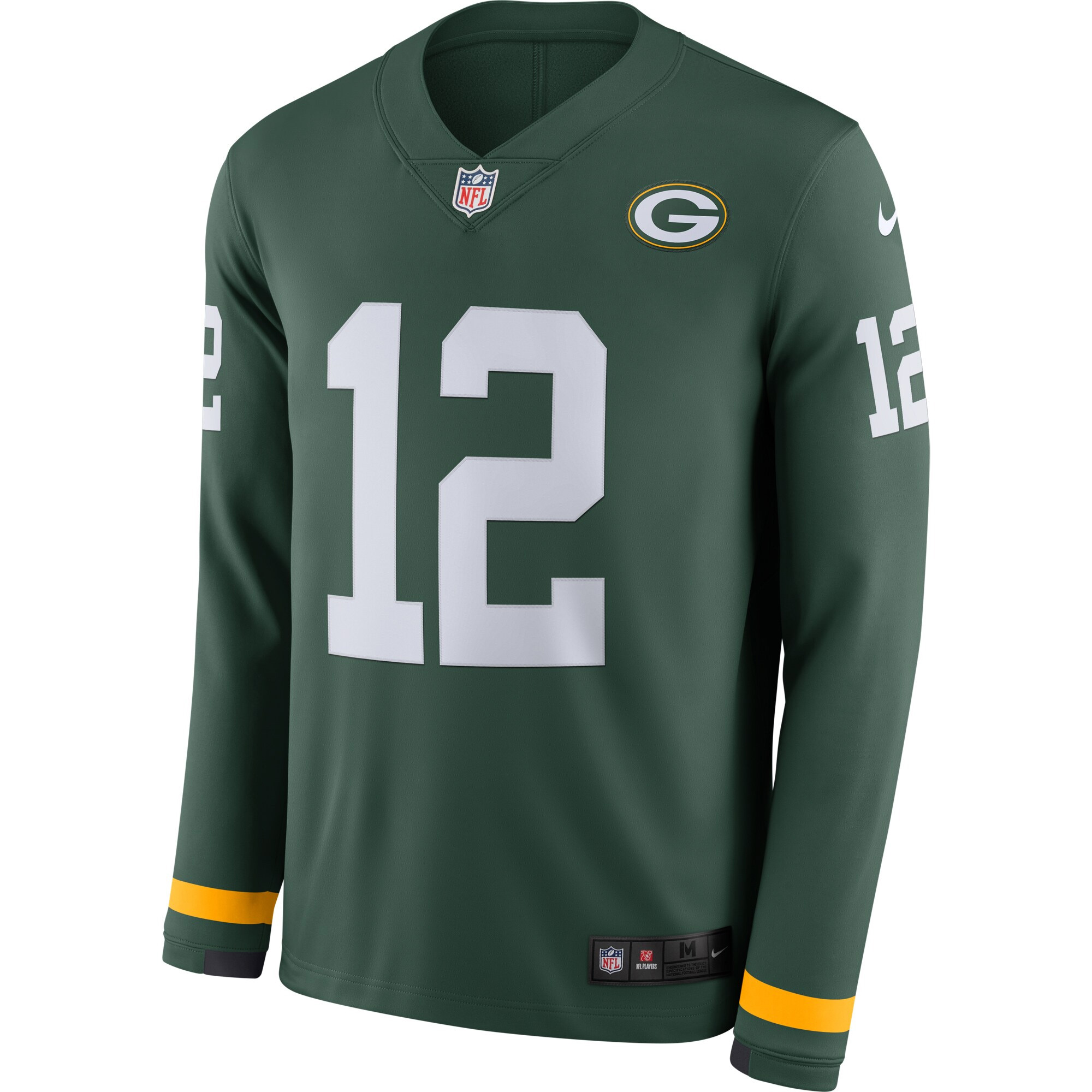 Rodgers’ name and number are fully stitched, while the Packers logo and team patch are expertly embroidered. With warm Therma fabric, this long-sleeve jersey is perfect for chilly Green Bay days.