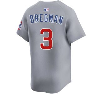 This Grey Road Limited Jersey showcases Alex Bregman representing the Chicago Cubs in a classic away style. The Cubs, known across Illinois for resilience and loyalty, carry Chicago pride wherever they play. The neutral grey base delivers a timeless road look, accented by fully stitched name and number that stand out clearly. The embroidered Cubs logo adds texture and depth, while stitched patches bring extra character. Designed for fans who follow the team on every road trip, this jersey offers comfort, clean details, and oversized sizing for a modern, easygoing feel.