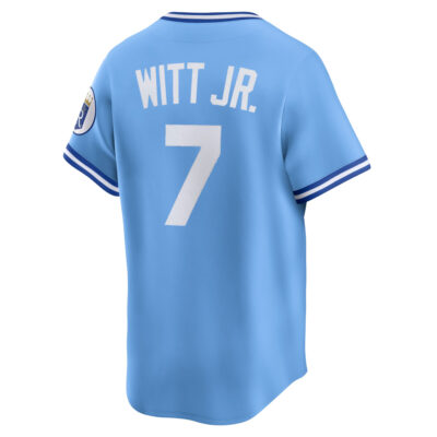 This Bobby Witt Jr Kansas City Royals Light Blue Cooperstown Collection Jersey – All Stitched is an essential piece of gear for any Kansas City Royals fan looking to highlight their favorite jersey and player. The Bobby Witt Jr Kansas City Royals Light Blue Cooperstown Collection Jersey and team details provide a kickoff-ready look that elevates your excitement for game day. Made with comfort in mind, this Kansas City Royals jersey delivers a standard, lightweight fit and features breathable mesh side panels for added ventilation.