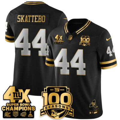 Honor four New York championships with this Black Gold Limited 4x Champions Jersey for Cam Skattebo. Blending a premium dark base with gold touches, it celebrates New York Giants tradition and NYG pride with a bold finish. All name, number, logos, and championship patches are stitched or embroidered for longevity. Oversized men’s sizes 5XL, 6XL, and 7XL offered.