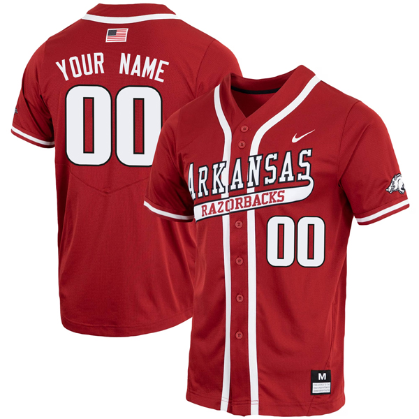 Show off personalized Arkansas pride with this Custom Cardinal Razorbacks Baseball Jersey. The rich cardinal color reflects the bold energy of Arkansas, while your fully stitched custom name and number add a personal finish. Embroidered team logos and stitched Razorbacks details complete the look, making this jersey a standout way to rep ARK spirit with your own unique twist.