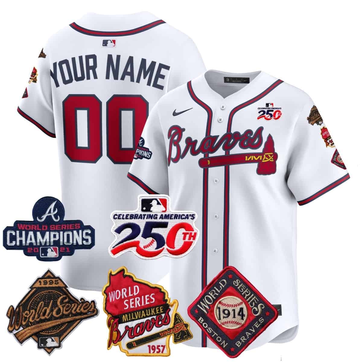 Celebrate the rich legacy of Georgia baseball with this Custom Atlanta Braves 4x World Series 250th US Anniversary White Limited Jersey. This all-stitched apparel piece honors the team’s historic victories with a detailed patch that connects the franchise’s success to national pride. Whether you are visiting the stadium or watching from home, this jersey is perfect to buy for your love of sports and the Braves. Featuring high-quality craftsmanship, this item has been satisfied by thousands of customers who demand excellence. The commemorative 250th US Anniversary patch serves as a symbol of state pride, making it a great gift for any dedicated fan wanting to represent their favorite team in style.