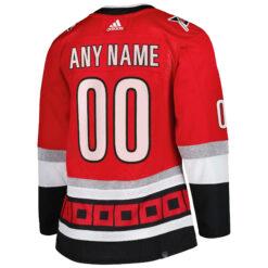 The Custom Carolina Hurricanes Red Home Jersey – All Stitched delivers the iconic home look of the Canes. With stitched name and number customization, embroidered logo, and crafted patchwork, this jersey represents Raleigh and North Carolina hockey energy.