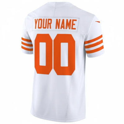 Celebrate the legacy of the Chicago Bears and Dick Butkus with this Custom White Throwback Vapor F.U.S.E Limited Jersey. The clean white base amplifies classic CHI football style, enhanced with your custom stitched name and embroidered numbers for a personalized touch. Embroidered patches and Bears logos highlight the team’s storied history while honoring one of Chicago’s most iconic players. Combining vintage inspiration with modern customization, this jersey is perfect for fans who want to carry Chicago pride with a timeless look.
