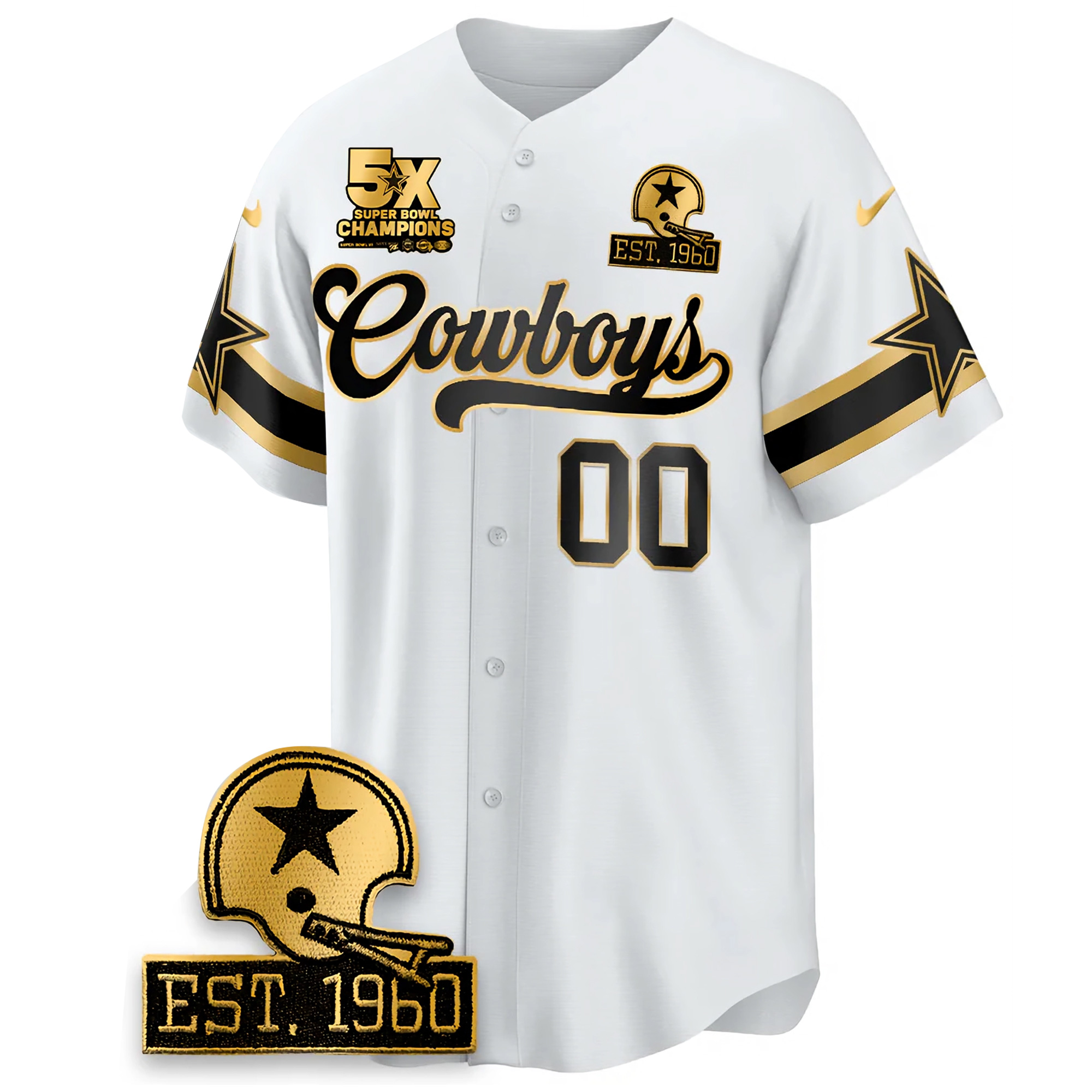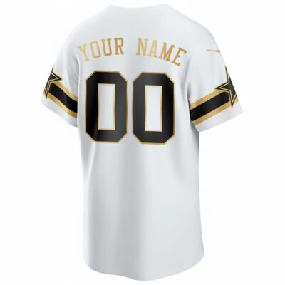 Represent the Dallas Cowboys with pride in the Custom 5 Time Champions White Gold Baseball Jersey. Featuring meticulously stitched or embroidered team details, including name, number, and logo, this jersey pays homage to the Cowboys’ five-time championship victories. The white and gold color scheme provides a classic yet modern look, enhanced with the state pride patch. Available in oversized sizes, this jersey ensures both style and comfort for every Cowboys fan.