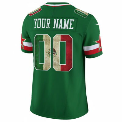 Revel in your Dallas Cowboys pride with this Custom Dallas Cowboys Mexico Green Vapor F.U.S.E Limited Jersey. The green color adds a unique touch to the traditional Cowboys look, while the Mexico edition patch shows your support for the team. Custom name, number, patch, and logo are stitched or embroidered for durability and quality. With oversized sizes (5XL, 6XL, 7XL) available, this jersey ensures that every fan can wear it with comfort and pride.