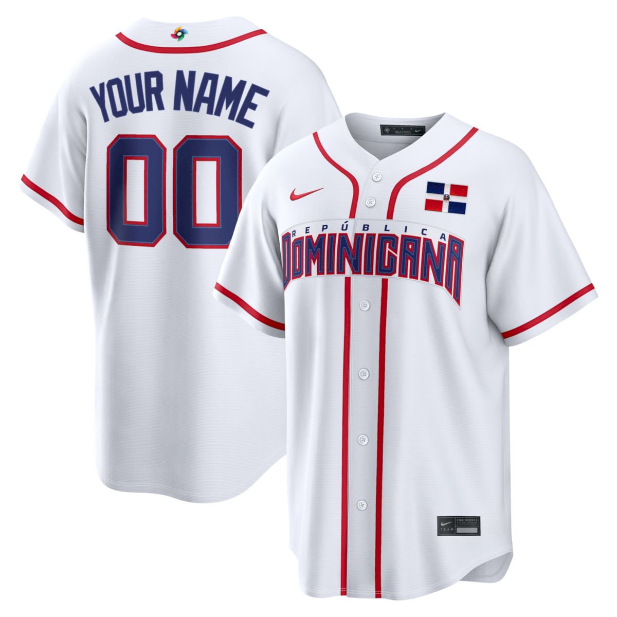This white design honors the proud baseball tradition of the Dominican Republic as the team competes in the 2026 World Baseball Classic. The Dominican Republic name carries global respect, representing a nation known for producing world-class baseball talent.