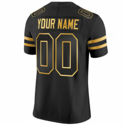 This Black Gold Jersey elevates Miami Hurricanes style with a refined color combination. Featuring the Hurricanes team name and Canes short name, the black base with gold accents highlights Florida pride in a bold way. Custom stitched name and number stand out clearly, supported by embroidered logos and Cotton Bowl patches. The gold detailing adds contrast and visual impact, making this jersey perfect for standout wear. Comfortable and stylish, oversized sizing is available.