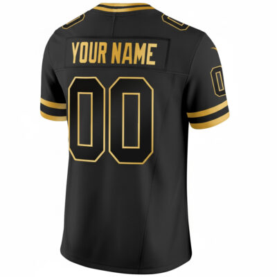 Bring luxury-inspired New York energy with this Black Gold 100th Season Anniversary custom jersey for the New York Giants. The black base paired with gold accents delivers a striking NYG aesthetic full of state pride. Personalize your own name and number, all finished with stitched or embroidered detailing. The patches and team logos add a premium touch that stands out in any collection. Perfect for fans who want a bold, refined Giants look. Oversized sizes 5XL, 6XL, 7XL available.