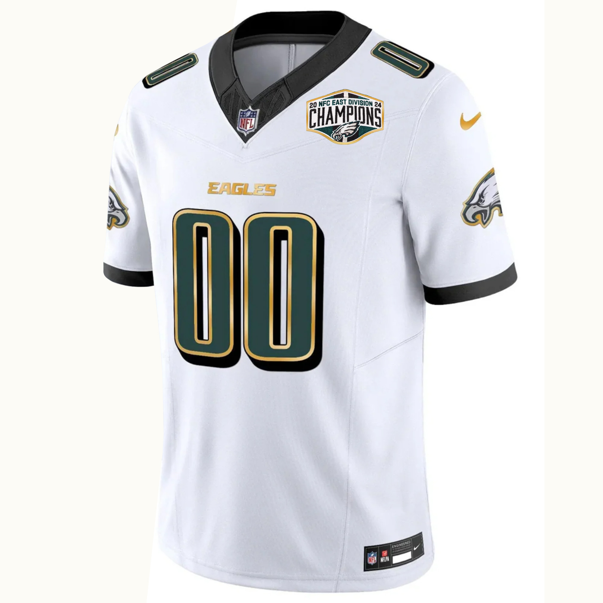 Celebrate Eagles success with the White Gold Trim 2024 NFC East Division Champions jersey. Featuring Philadelphia Eagles branding, Eagles short name elements, and state pride, this jersey includes stitched or embroidered name, number, logo, and division patch. The white base with gold accents delivers a clean yet powerful look. Oversized sizing is available for fans who prefer relaxed comfort.
