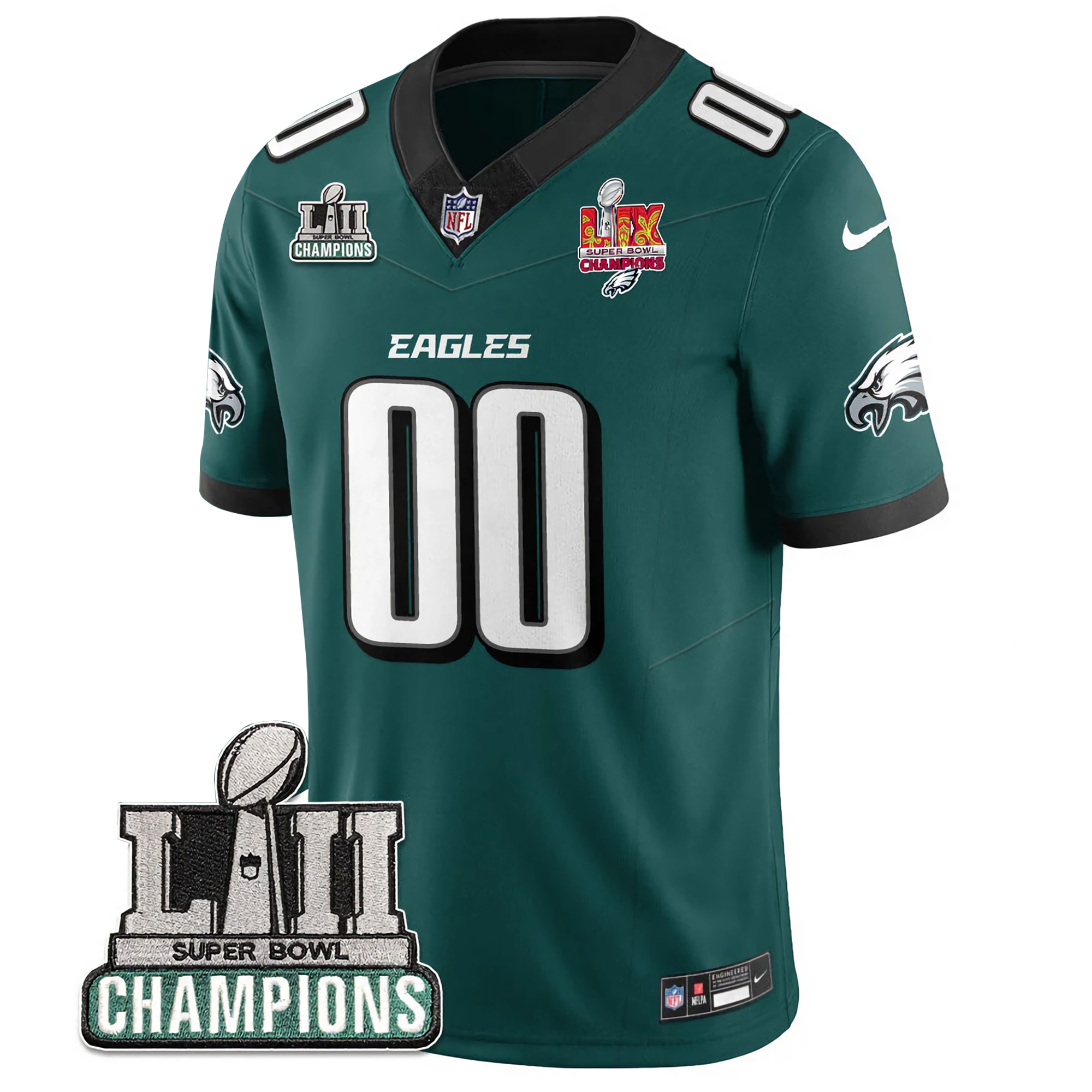 Celebrate the legacy of the Philadelphia Eagles with this Super Bowl LII & LIX Champions Midnight Green jersey. Designed to honor Eagles pride and Pennsylvania football culture, this piece highlights the team name, Eagles short name identity, and championship history. The name, number, logo, and Super Bowl patches are fully stitched or embroidered, delivering bold texture and long-lasting detail. Midnight green represents the heart of Philly fandom and city pride. Perfect for game day or streetwear styling, oversized sizes are also available for a relaxed and confident fit.