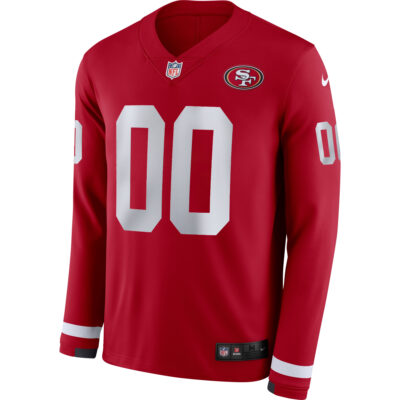 Craft your own piece of 49ers pride with this Custom San Francisco 49ers Scarlet Therma Long Sleeve Jersey. Featuring a fully stitched custom name and number along with the embroidered SF logo, this jersey celebrates California football heritage. The scarlet base reflects the spirit of the Niners and their loyal fanbase. Made with Therma material for warmth, it’s the perfect personalized piece for any Bay Area supporter.
