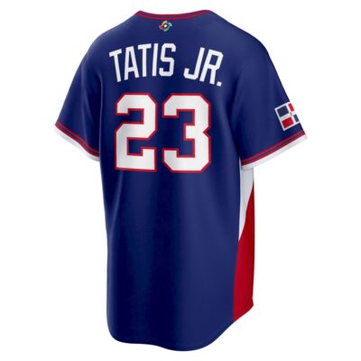 This royal blue road style highlights Dominican Republic Baseball’s electrifying presence in the 2026 World Baseball Classic. The DR short name reflects bold confidence and deep island pride. Fernando Tatis Jr. is celebrated for his dynamic athleticism, speed, and highlight-reel plays that energize every crowd. Fully stitched details create lasting quality and visual impact. Ideal for fans who love Tatis’ fearless style and want to represent DR Baseball, satisfied by thousands of customers.