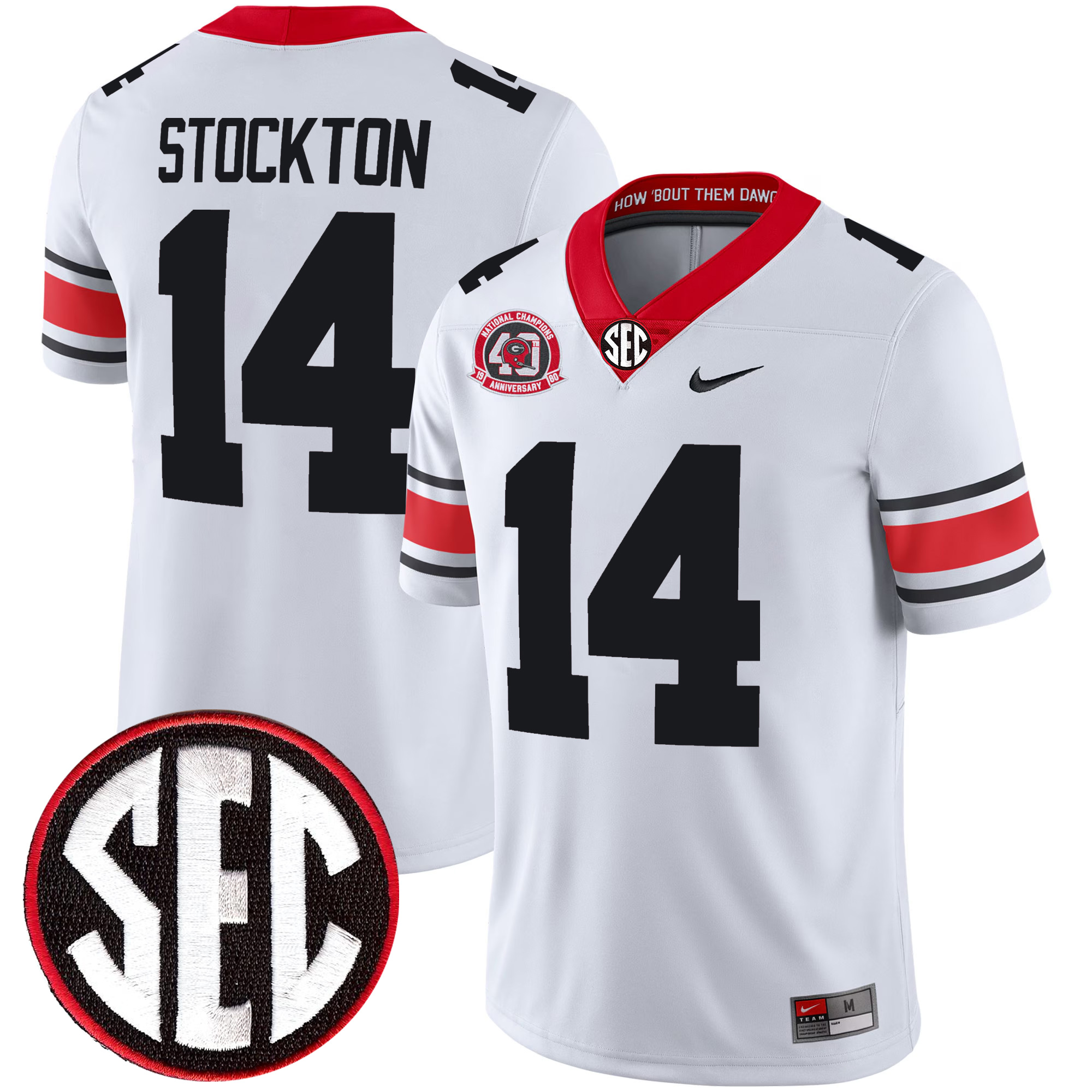 Celebrate Georgia Bulldogs history with this Gunner Stockton White 40th NC Anniversary Jersey featuring a stitched SEC patch. Honoring four decades since a championship milestone, this design blends modern Georgia pride with meaningful tradition. The white layout highlights the Dawgs’ UGA short name while giving space for the commemorative details to shine. All elements—name, number, logo, patch, and anniversary accents—are stitched or embroidered to create a premium, lasting finish. This jersey brings together historic Georgia football energy and Gunner Stockton’s current spotlight for a truly memorable look.