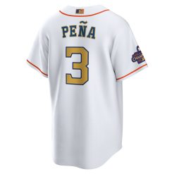 This Jeremy Peña Houston Astros White 2023 Gold Collection Jersey – All Stitched is an essential piece of gear for any Jeremy Peña Houston Astros fan looking to highlight their favorite jersey and player. The Jeremy Peña Houston Astros White 2023 Gold Collection Jersey and team details provide a kickoff-ready look that elevates your excitement for game day. Made with comfort in mind, this Jeremy Peña Houston Astros jersey delivers a standard, lightweight fit and features breathable mesh side panels for added ventilation.