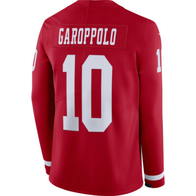 Step into California football tradition with this San Francisco 49ers Scarlet Therma Long Sleeve Jersey featuring Jimmy Garoppolo. The deep scarlet proudly represents the “SF” identity and Northern California pride. With bold stitched name and number and a sharp embroidered 49ers logo, this jersey perfectly blends classic team style with modern comfort. The Therma fabric keeps you warm on chilly Bay Area days, making it ideal for dedicated fans who rep the Niners year-round.
