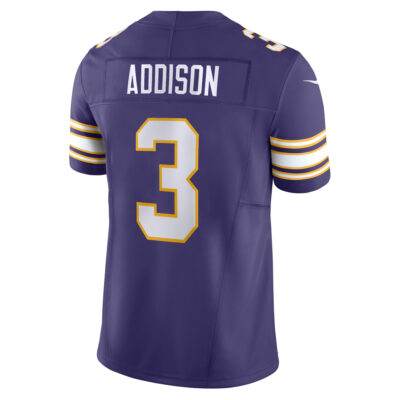 The Jordan Addison Minnesota Vikings Purple Classic Vapor F.U.S.E Limited Jersey – All Stitched honors tradition while pushing forward. Every stitched letter and embroidered patch reflects Minnesota football culture, linking Addison’s promise with the franchise’s historic pride.