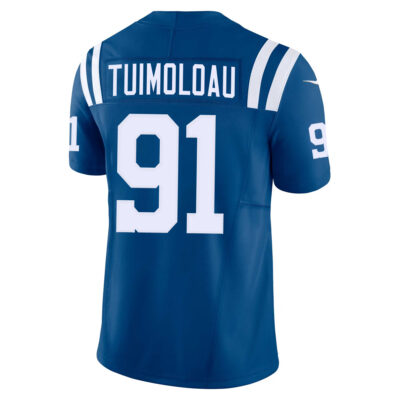 This JT Tuimoloau Indianapolis Colts Royal Blue Home Vapor F.U.S.E Limited Jersey – All Stitched is an essential piece of gear for any Indianapolis Colts fan looking to highlight their favorite jersey and player. The JT Tuimoloau Indianapolis Colts Royal Blue Home Vapor F.U.S.E Limited Jersey and team details provide a kickoff-ready look that elevates your excitement for game day. Made with comfort in mind, this Personalized Indianapolis Colts jersey delivers a standard, lightweight fit and features breathable mesh side panels for added ventilation.