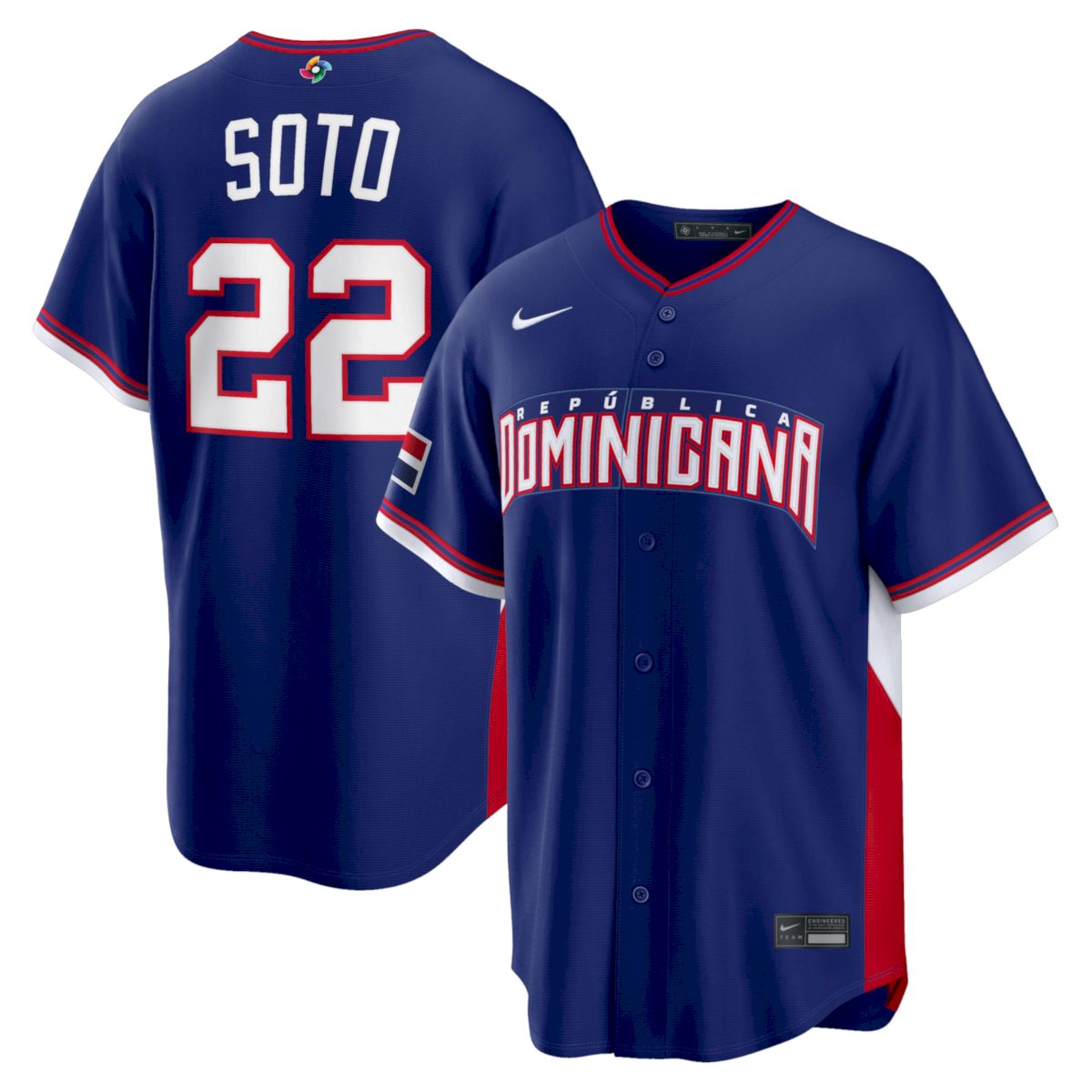 This royal blue road design celebrates Dominican Republic Baseball on the global stage of the 2026 World Baseball Classic. The DR short name represents passion, rhythm, and unmatched Caribbean pride that unites fans across the island and worldwide. Juan Soto is known for his elite plate discipline, powerful swing, and confident presence in clutch moments. His ability to change a game with one at-bat makes him a centerpiece of the Dominican lineup. Fully stitched detailing enhances durability and bold presentation, perfect for tournament watch parties or meaningful gifts. A must-have for supporters of Soto and DR Baseball, satisfied by thousands of customers.