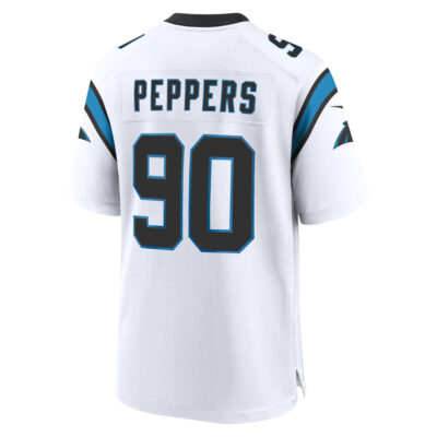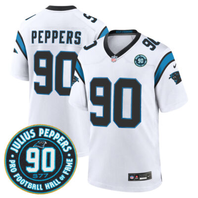 This Julius Peppers Carolina Panthers White Road Game Jersey w/ HOF Patch – All Stitched is an essential piece of gear for any Carolina Panthers fan looking to highlight their favorite jersey and player. The Julius Peppers Carolina Panthers White Road Game Jersey w/ HOF Patch and team details provide a kickoff-ready look that elevates your excitement for game day. Made with comfort in mind, this Julius Peppers Carolina Panthers jersey delivers a standard, lightweight fit and features breathable mesh side panels for added ventilation.