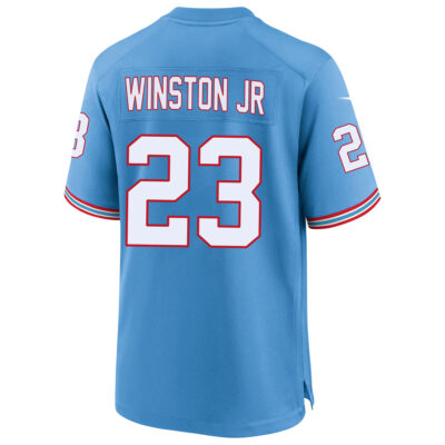 This Kevin Winston Jr Tennessee Titans Light Blue Alternate Oilers Throwback Jersey – All Stitched is an essential piece of gear for any Tennessee Titans fan looking to highlight their favorite jersey and player. The Kevin Winston Jr Tennessee Titans Light Blue Alternate Oilers Throwback Jersey and team details provide a kickoff-ready look that elevates your excitement for game day. Made with comfort in mind, this Kevin Winston Jr Tennessee Titans jersey delivers a standard, lightweight fit and features breathable mesh side panels for added ventilation.