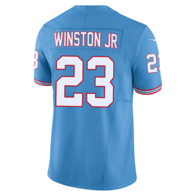This Kevin Winston Jr Tennessee Titans Light Blue Alternate Oilers Throwback Vapor F.U.S.E Limited Jersey – All Stitched is an essential piece of gear for any Tennessee Titans fan looking to highlight their favorite jersey and player. The Kevin Winston Jr Tennessee Titans Light Blue Alternate Oilers Throwback Vapor F.U.S.E Limited Jersey and team details provide a kickoff-ready look that elevates your excitement for game day. Made with comfort in mind, this Kevin Winston Jr Tennessee Titans jersey delivers a standard, lightweight fit and features breathable mesh side panels for added ventilation.