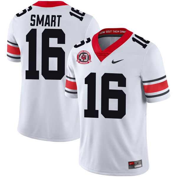 This Kirby Smart Georgia Bulldogs Football White 40th NC Anniversary Jersey – All Stitched is an essential piece of gear for any Georgia Bulldogs Football fan looking to highlight their favorite jersey and player. The Kirby Smart Georgia Bulldogs Football White 40th NC Anniversary Jersey and team details provide a kickoff-ready look that elevates your excitement for game day. Made with comfort in mind, this Kirby Smart Georgia Bulldogs Football jersey delivers a standard, lightweight fit and features breathable mesh side panels for added ventilation.