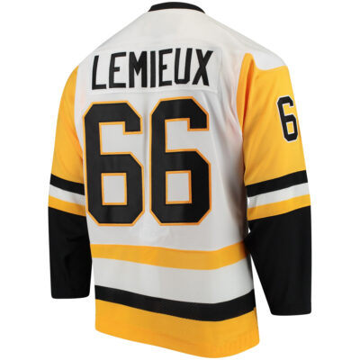 The Mario Lemieux Pittsburgh Penguins White Heroes Of Hockey Throwback Jersey – All Stitched pays tribute to the Penguins’ history with a timeless white retro look. With stitched logos, embroidered player details, and throwback striping, it celebrates the era when Lemieux defined excellence in Pittsburgh. A perfect way to show pride in both the player and the state that shaped hockey greatness.