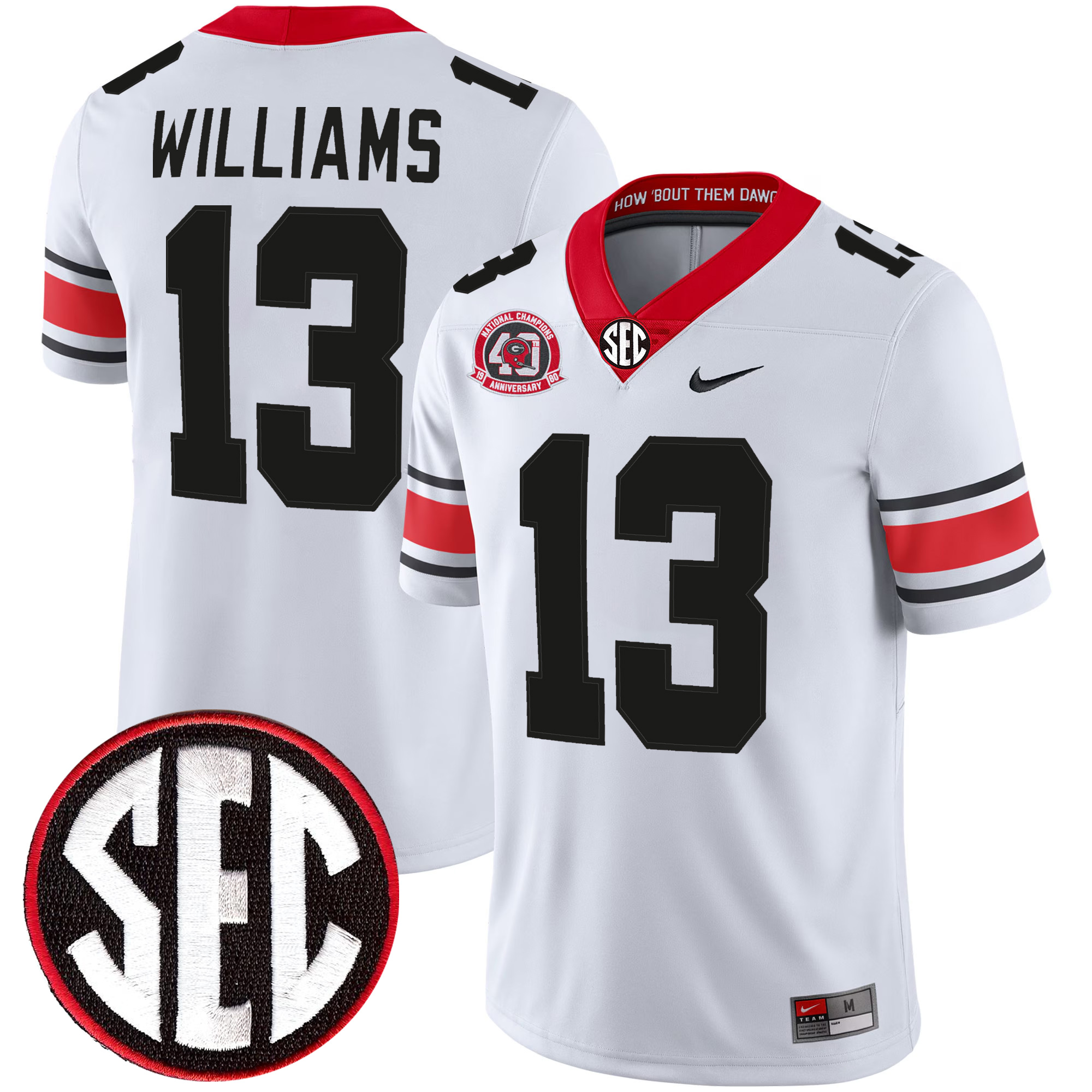 Honor Georgia’s championship legacy with this Mykel Williams 40th NC Anniversary Jersey in white, complete with a stitched SEC patch. All name, numbers, anniversary patch, and team logo are fully stitched for a meaningful, long-lasting finish.