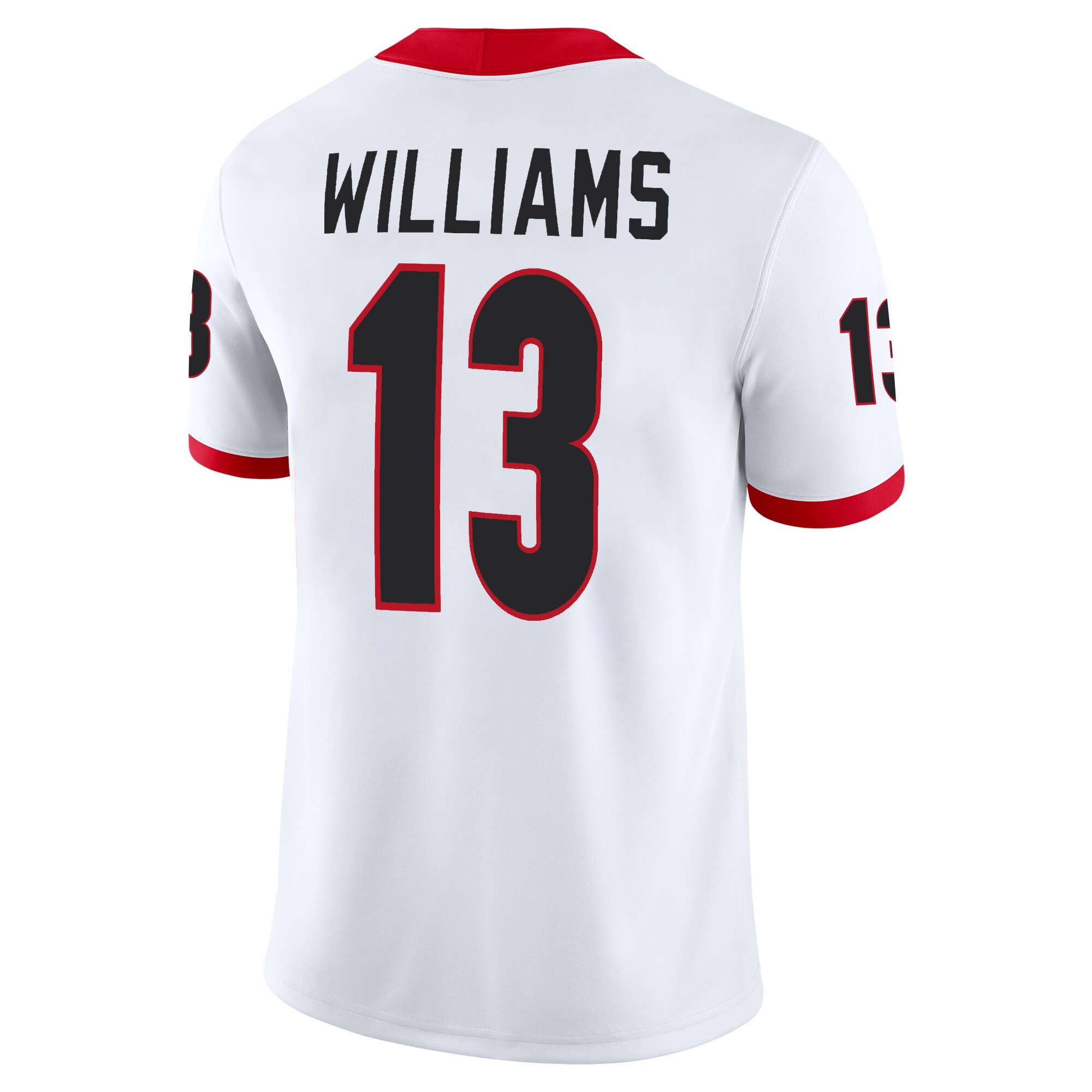 Celebrate the power of Georgia football on the road with this Mykel Williams Georgia Bulldogs Football White Away Game Jersey. Representing the University of Georgia with a clean, crisp white base, this design highlights Dawgs pride in a bold, modern way. Every name, number, patch, and logo is fully stitched, giving the jersey a textured, layered finish that emphasizes attention to detail and long-term durability.