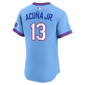 Elevate your game day collection with the Ronald Acuna Jr. Atlanta Braves Powder Blue 2026 City Connect Stadium Elite Jersey. This all-stitched garment honors the incredible talent of Ronald Acuna Jr., a powerhouse player known for his National League MVP performance and dynamic presence on the field. Designed to reflect the unique culture of Atlanta, this jersey allows you to showcase your state pride during every big game. Our products are satisfied by thousands of customers who appreciate the premium feel and attention to detail. It is perfect to buy for your love of sports or as a great gift for any die-hard fan. Celebrate the Braves in style with this elite jersey.