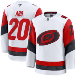 The Sebastian Aho Carolina Hurricanes White Away Jersey – All Stitched provides a timeless road look with stitched name and number, embroidered Hurricanes crest, and durable patches. North Carolina hockey loyalty shines through in this piece built for Canes fans everywhere.