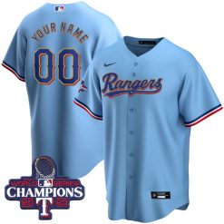 We want fans to celebrate your fandom by personalizing your gear, like jerseys, with your own text. For these customizable products, including jerseys, we invite customers to tell us how they would like their preferred name or other text to appear by typing that text into the field indicated. Give your jersey collection a boost with the help of this Texas Rangers Light Blue Jersey. Get your young fan geared up in this eco-friendly Custom Texas Rangers Light Blue Jersey, boasting Texas Rangers graphics for an fantastic feel on the field.