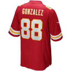 Pay tribute to Hall of Fame tight end Tony Gonzalez with this red home game jersey. Featuring stitched name and numbers, embroidered KC patches, and the arrowhead logo, it represents Missouri football pride and the golden era of the Chiefs.