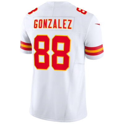 Celebrate Tony Gonzalez and KC tradition with this Vapor F.U.S.E Limited white road jersey. Combining Dri-FIT performance with twill name/number applications, stitched patches, and embroidered KC logos, it honors Missouri football and Chiefs greatness.