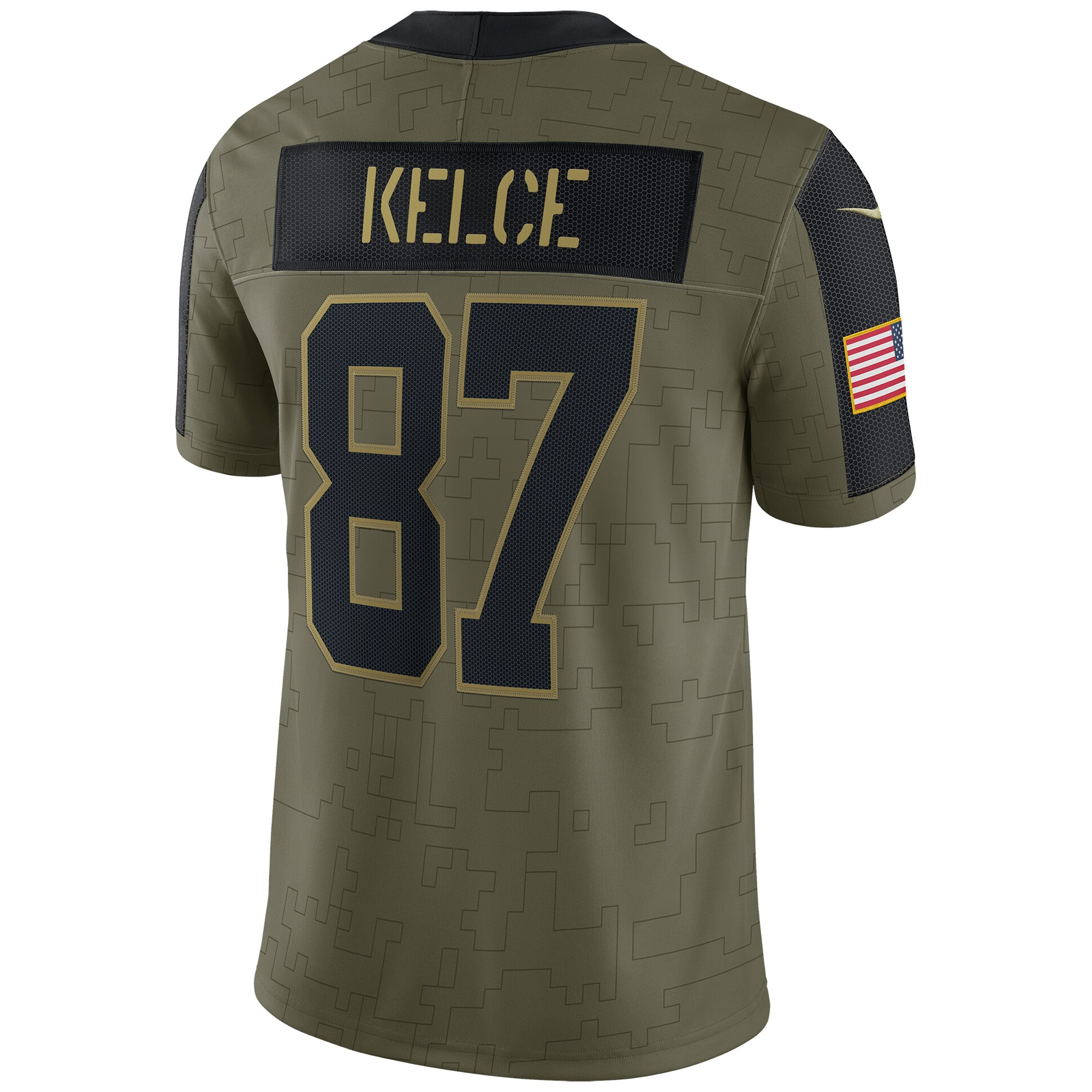This olive Salute To Service jersey from 2021 celebrates Travis Kelce and honors the military community. With embroidered Chiefs logos, stitched numbers, and KC patches, it brings together Missouri football tradition and a meaningful tribute.