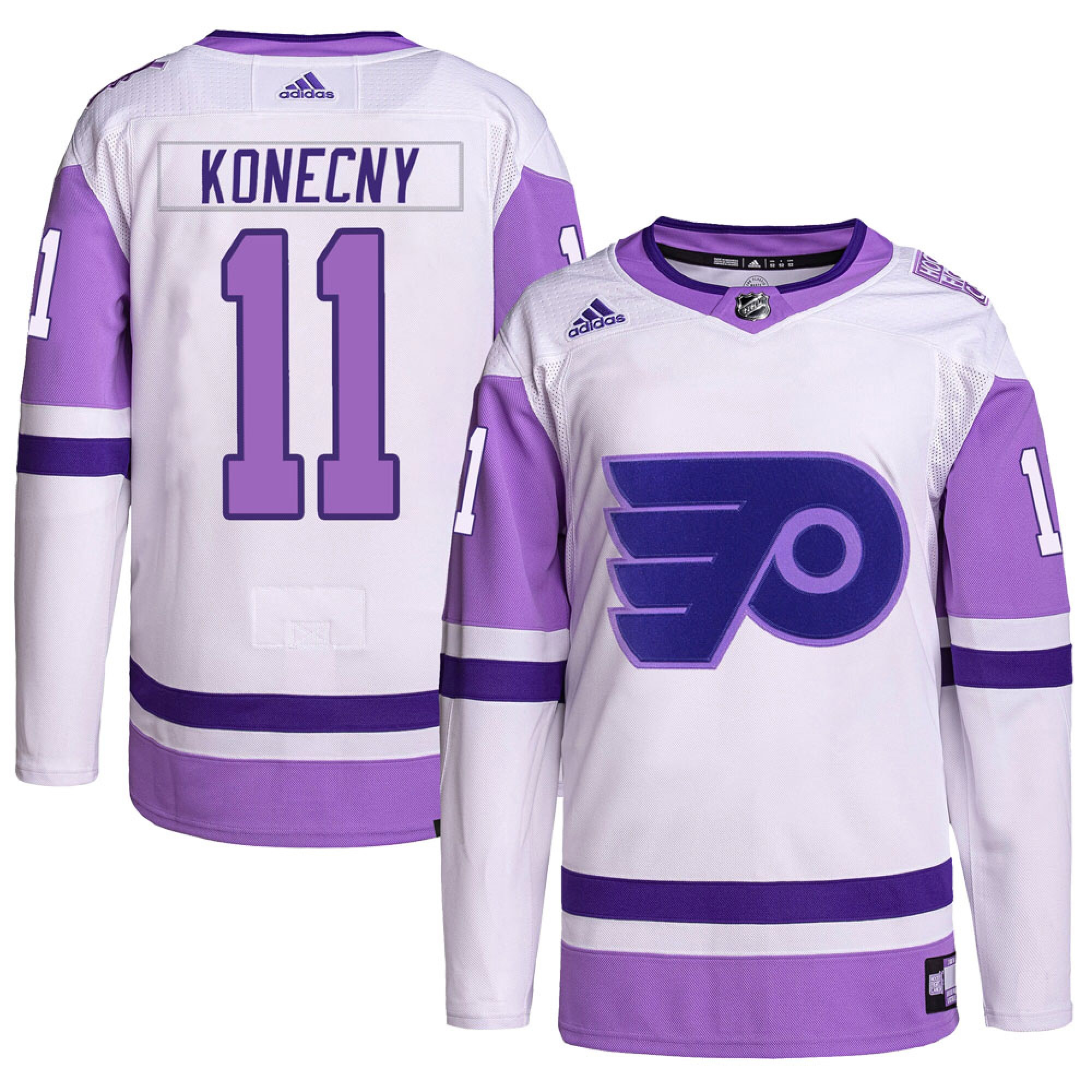 Travis Konecny Philadelphia Flyers White Purple 2024 Hockey Fights Cancer Primegreen Jersey – All Stitched