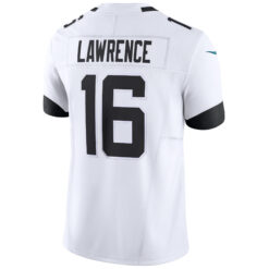 Travel in style with the Trevor Lawrence Jacksonville Jaguars White Road Vapor F.U.S.E Limited Jersey – All Stitched. Designed for the Limited series, it features a standard fit, Dri-FIT technology, heat-transferred twill accents, and a chainmaille mesh grill collar. Combined with stitched player name and number, embroidered team patches, and detailed Jaguars logos, this jersey represents Jacksonville loyalty wherever the Jaguars go.